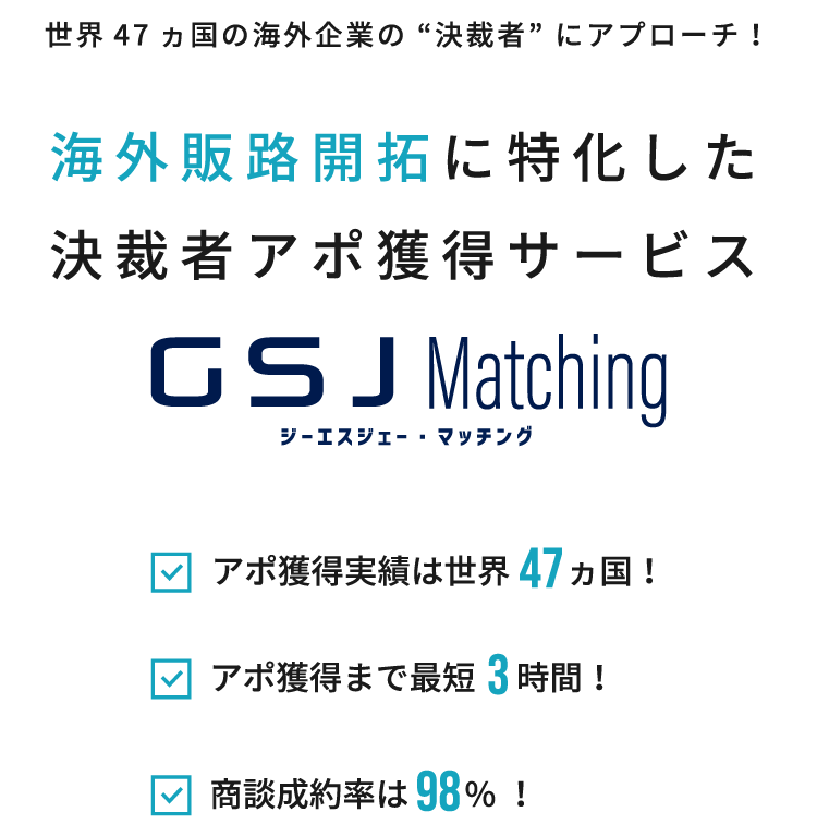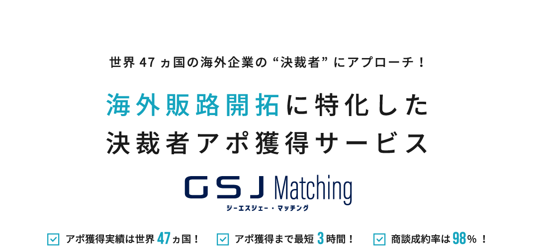 GSJ Matchingを運営するグローカルソリューションズジャパン代表の深野は、世界最大規模のビジネス交流組織BNIに所属しており、自身も世界47カ国に販路開拓を行ってきた経験や実績を持っているため、これまでに取引のある海外企業や知り合いの海外企業、海外経営者のツテなどを活用することで、通常の新規営業やアポイント獲得代行では叶わないような、前向きで積極的な海外企業とのアポイント獲得が可能です。人脈伝いだからこそ、スピード感のあるアポイント獲得や、圧倒的な商談成約率を実現することができました。